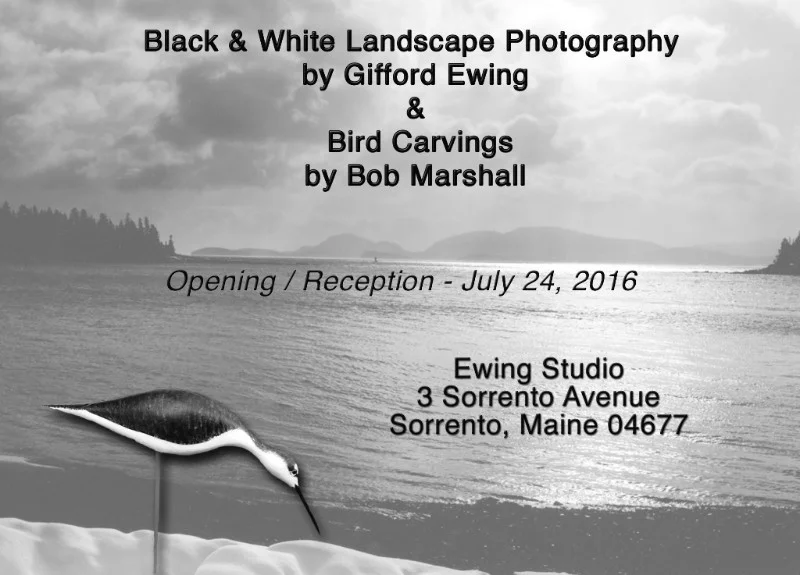 Join Gifford Ewing and Bob Marshall at Ewing Studios for an open reception featuring Gifford's Black and White Landscape Photography and Bob Marshall's Bird Carvings.