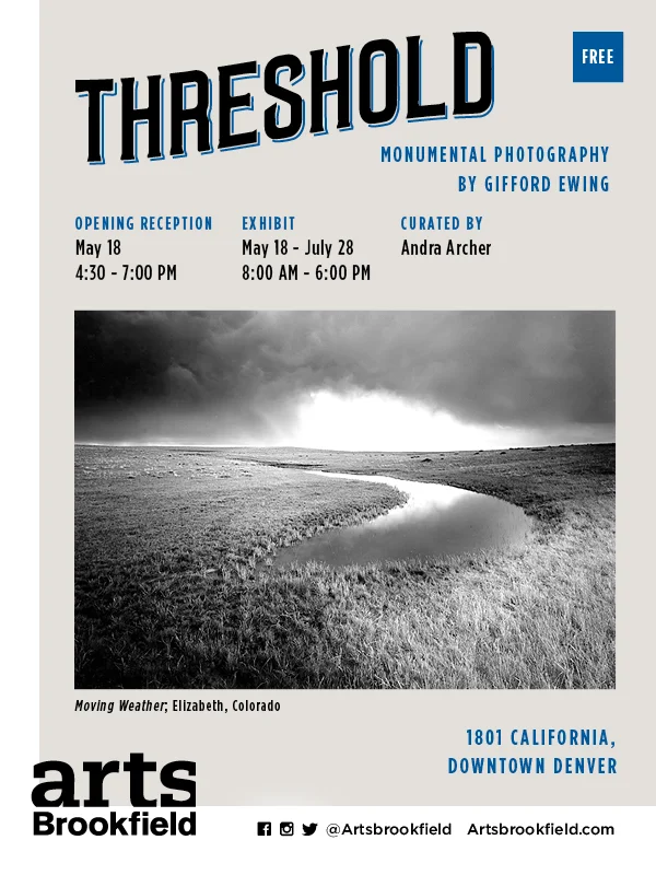 Gifford Ewing has long captured in powerful and enigmatic ways the rural and urban landscapes of the American West, using traditional photographic techniques. So it is with Threshold, on display at 1801 California. The rich tonality and sheer size of his newer, larger format works transcend the limitations of scale and offer the viewer not just a window to the natural world, but a doorway. One feels as if they are standing on the precipice of reality, invited to step across the threshold and into the grandeur of the environment itself. Smaller color photographs extend the same invitation through quiet and dramatic play of light and hue upon remote locations. Take a moment out of your day to cross the threshold into Ewing’s majestic works.